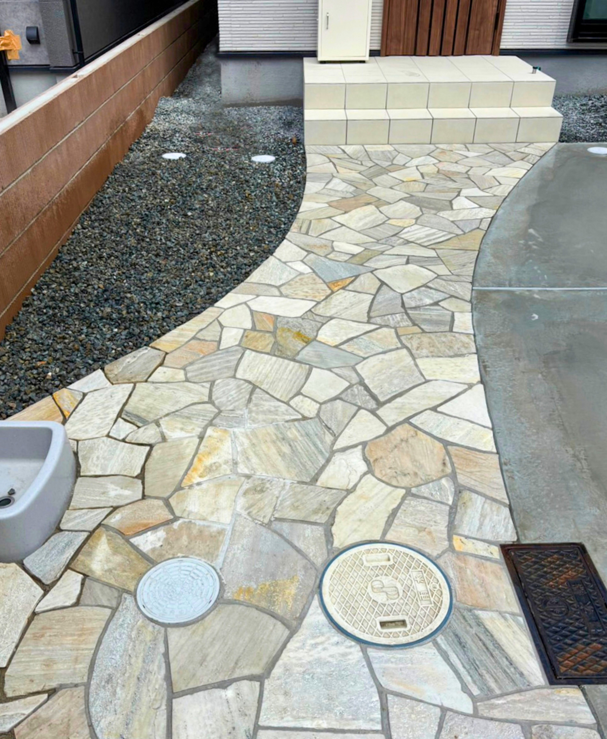 アプローチは乱形石貼りにしまして、お色は白系で統一しましたのでめちゃくちゃ綺麗ですよねヾ(๑╹◡╹)ノ"ピンコロ石でカーブ状にラインをひき色のアクセントにもなっています☀︎