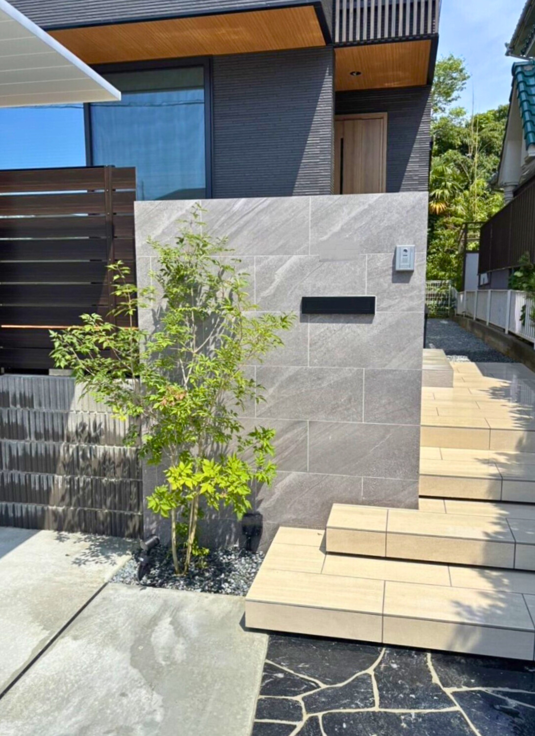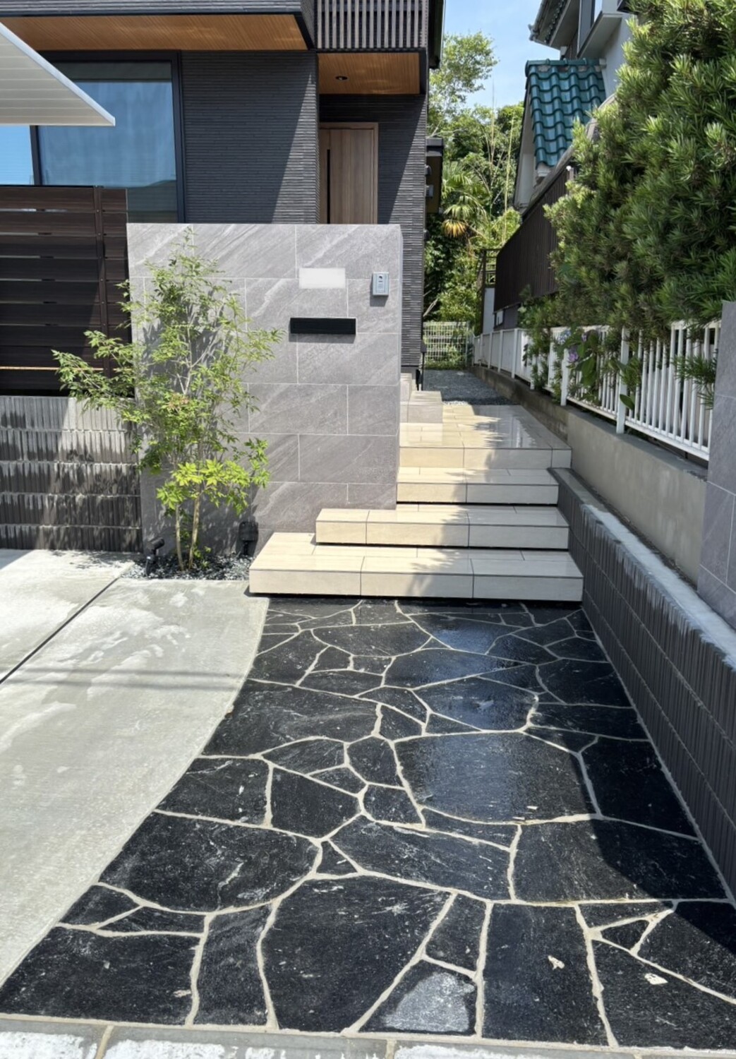 明るい色がブラックの乱形石貼りほどよくコントラストになって、全体がグッと引き立っていますね☆