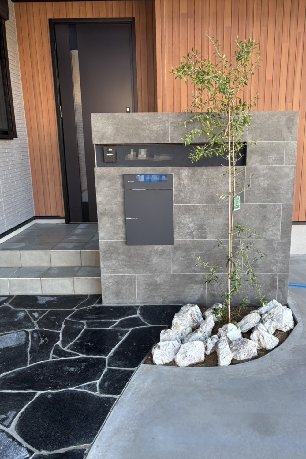 門柱前にはゴロタ石を置き、植栽とのバランスでよりオシャレな印象に仕上げました♪