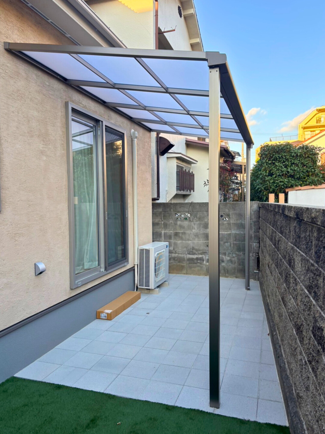 お庭には、天候を気にせず安心して洗濯物を干せるよう、テラス屋根を設置させていただきました(^-^)