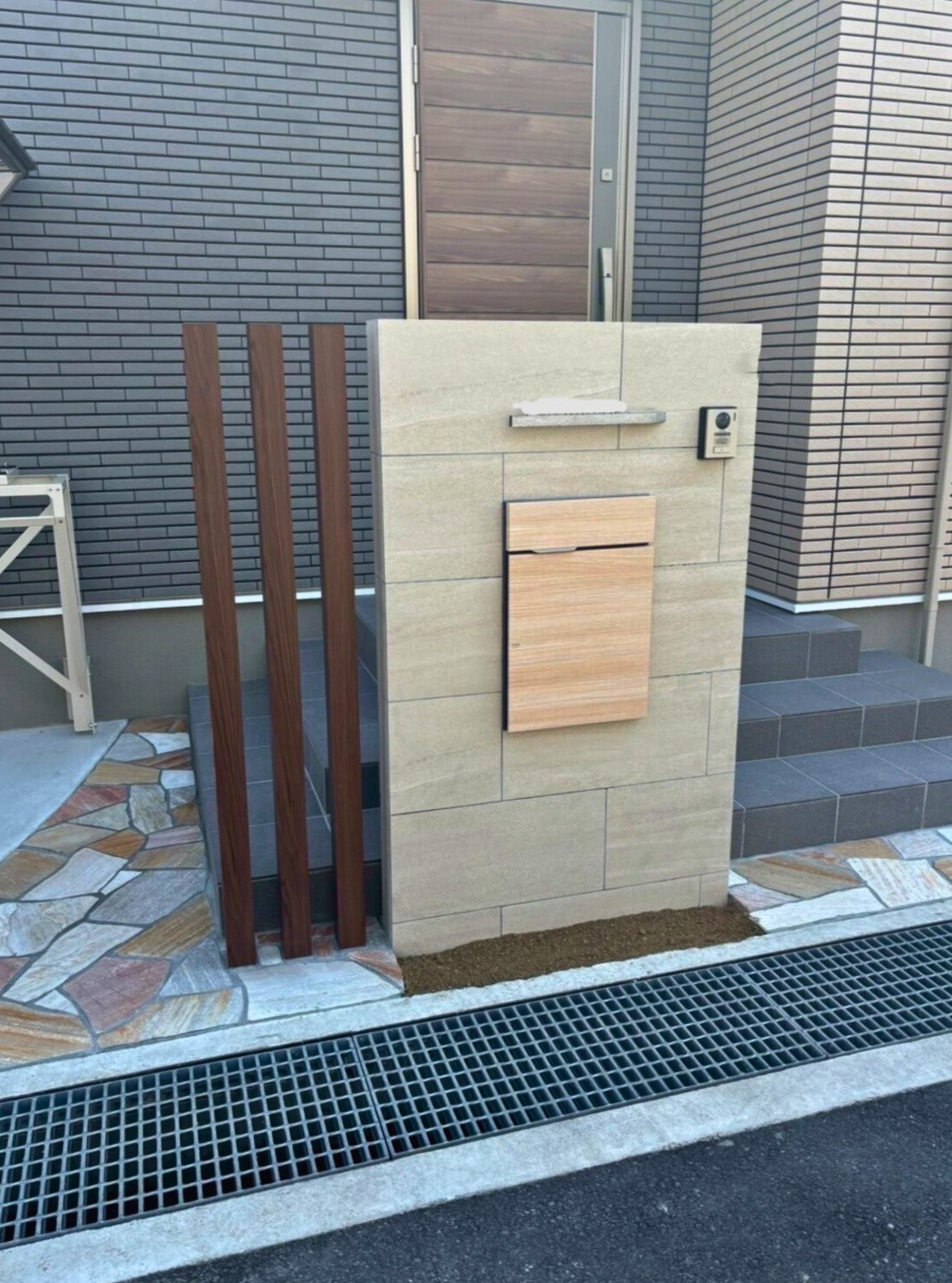 3本の角柱がアクセントになり、宅配BOXの木目調が乱形石貼りと相まってまとまった印象になりました!(^^)!