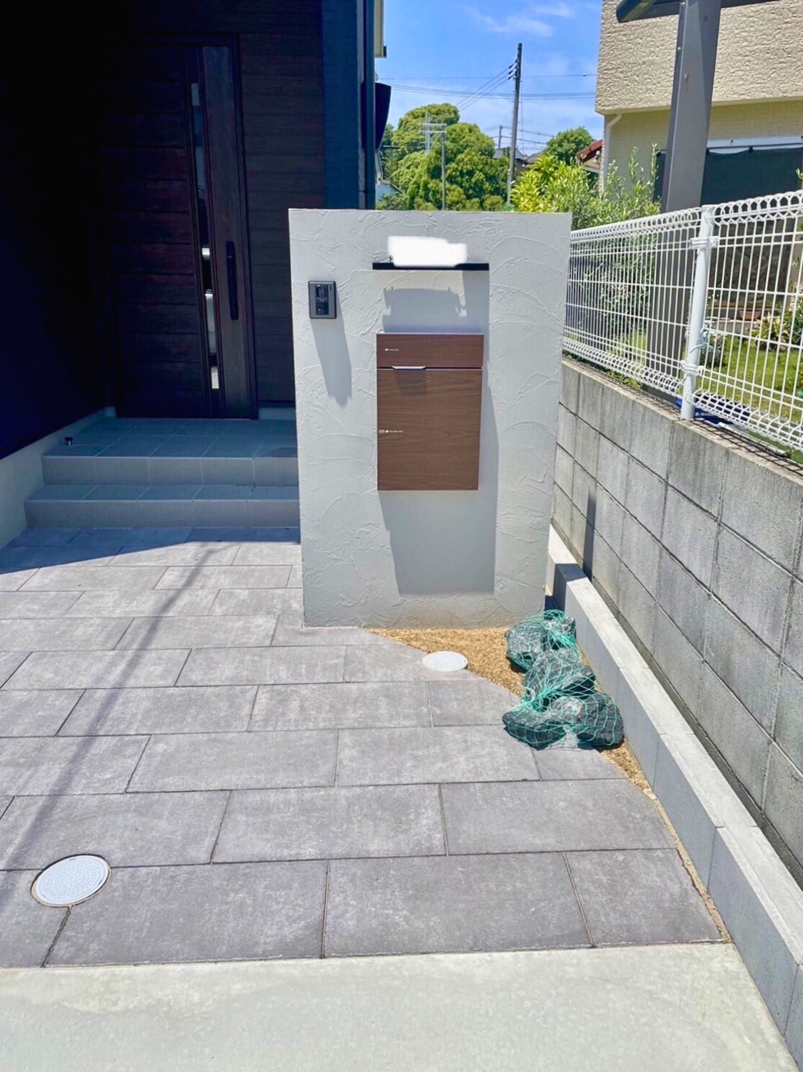 敷いている平板部分を丸くしてアクセントにしています★エクレルという平板でダークグレーのお色です。これから植栽を植えたりできるので楽しいですね〜╰(*´︶`*)╯