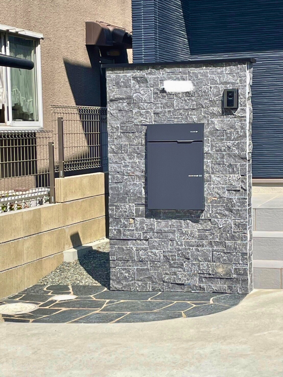 まず、門柱ですがタイル貼りのおしゃれな門柱です╰(*´︶`*)╯アンテプレートと言う天然石貼り材を使用しています⬜︎ブラック系のお色をチョイスされましたので重厚感がありかっこいですね❤︎他にもイエロー系、ベージュ系、ブラウン系、グレー系と様々なお色があるのですがどれも天然石ならではの上質な感じがとっても素敵ですのでぜひお好みに合わせてお選びくださいね✏︎