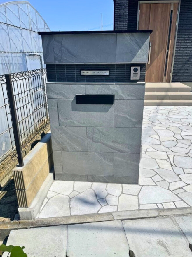 門柱はライムストーンデザインが上品なアヴァンティタイルに、アクセントでモザイクタイルをプラスしました!