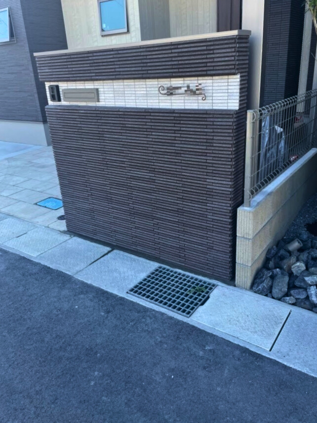 門柱は2種類のタイルを使ってモダンに仕上げました。