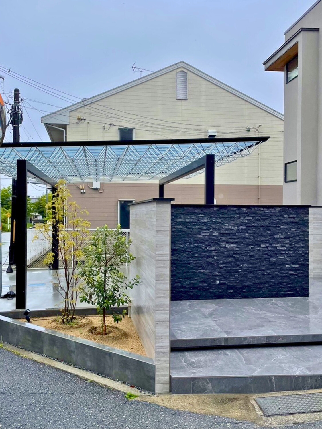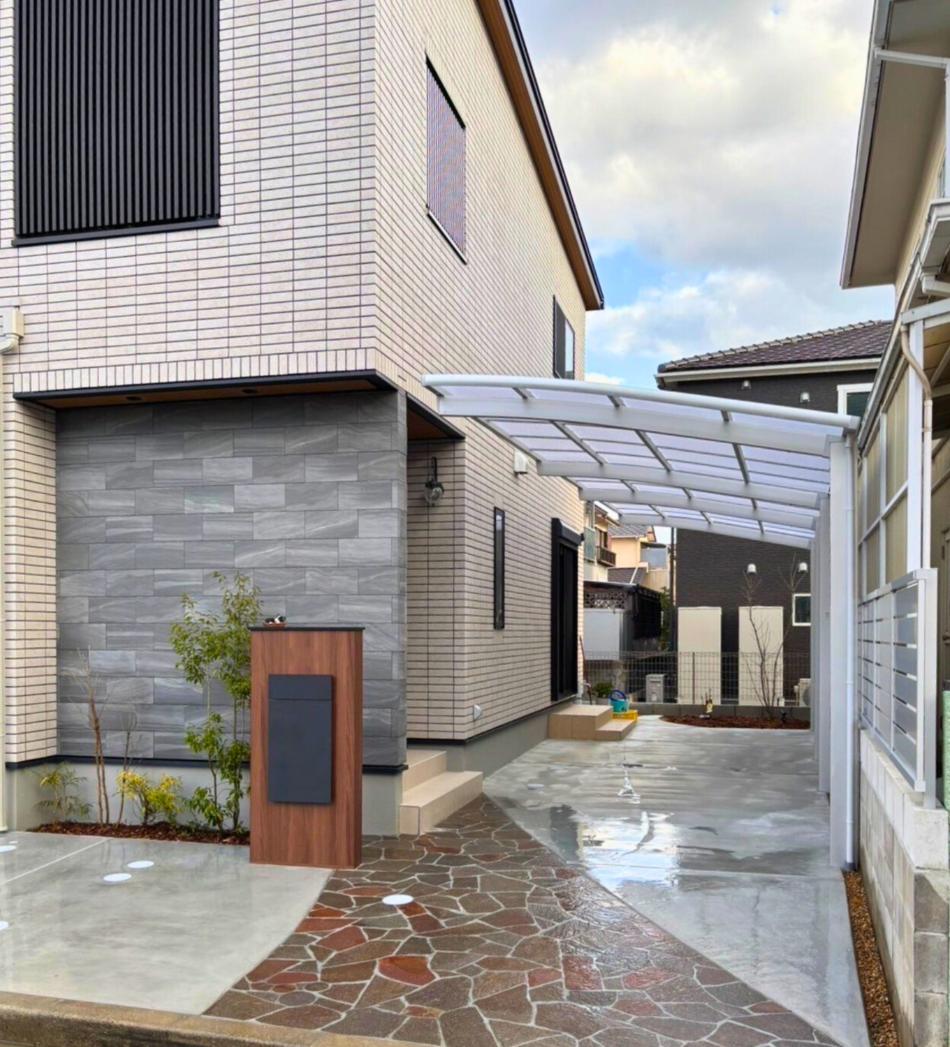 H様は玄関から出入りすることがほとんどなく、勝手口から出入りすることが多いとの事でしたので勝手口周りを充実出来るようカーポートを設置しましたⓅ