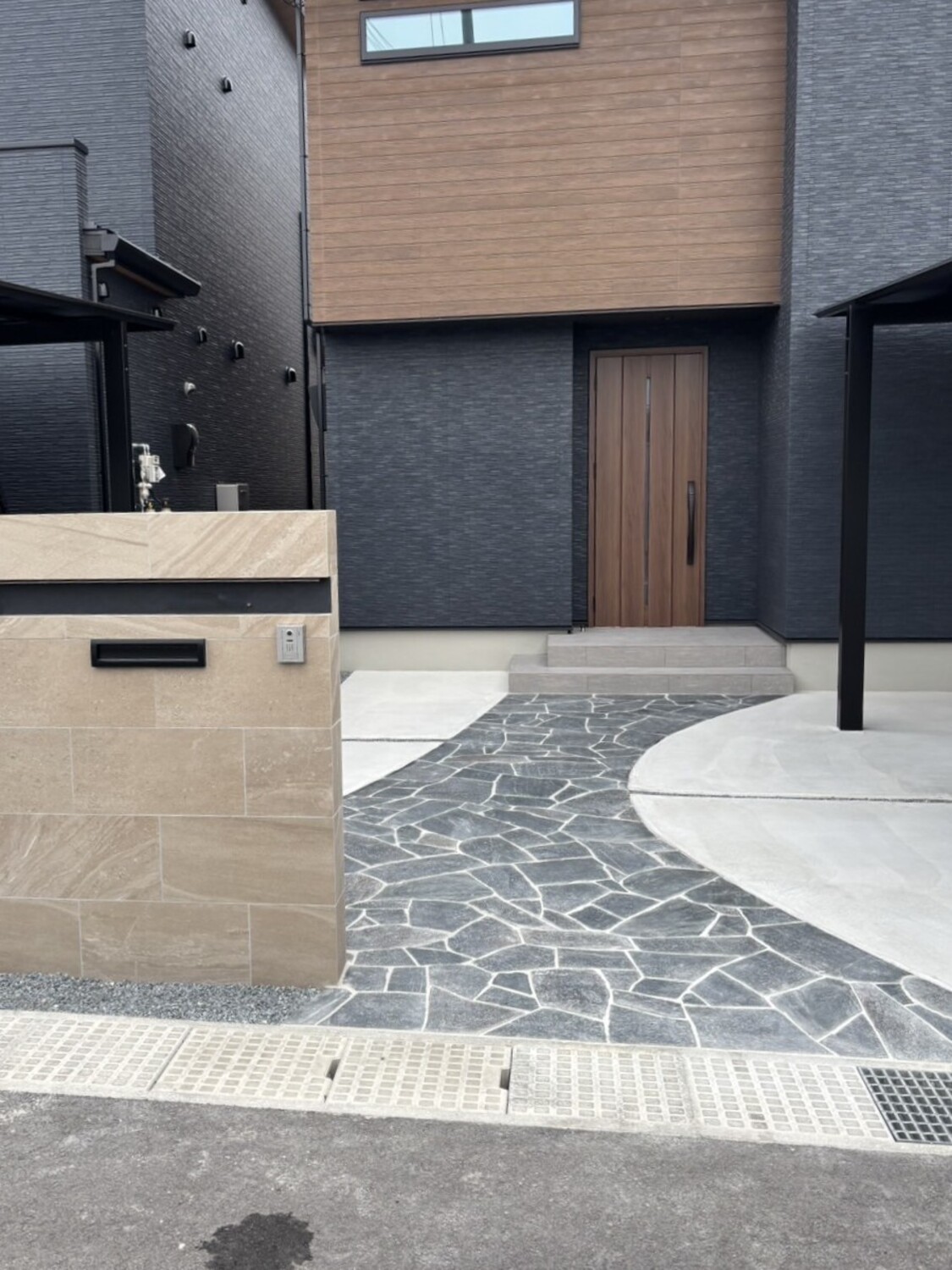 アプローチにはブラック系の乱形石貼りを採用☆彡