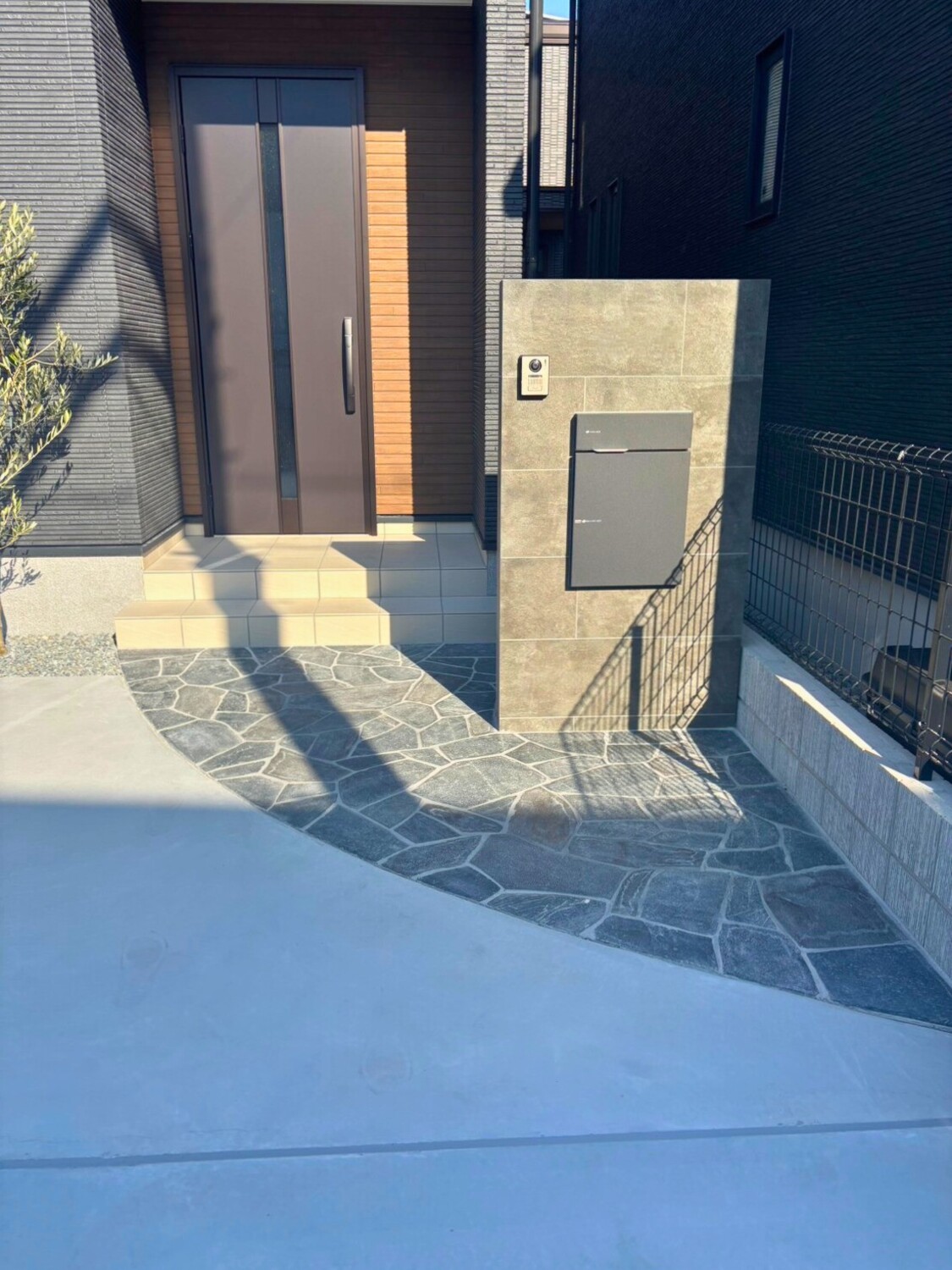 門柱まわりから玄関ポーチへとつながる動線には、やわらかな曲線を描く乱形石貼りを採用しました。