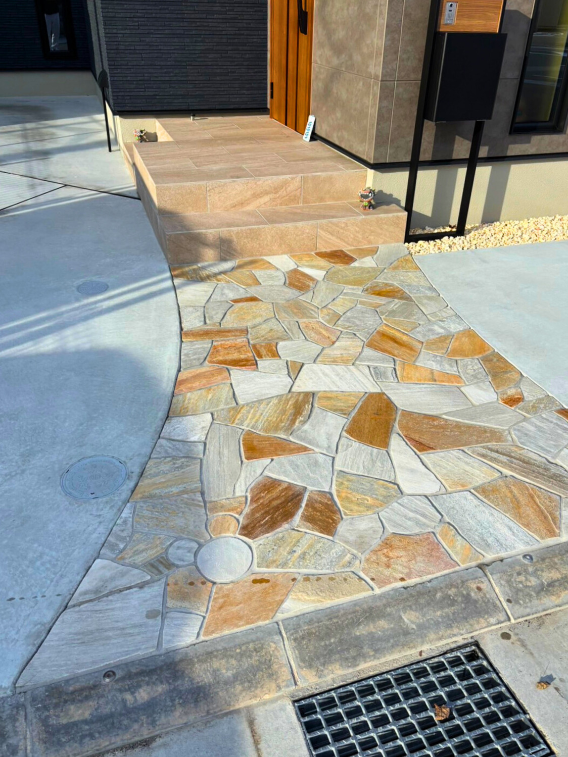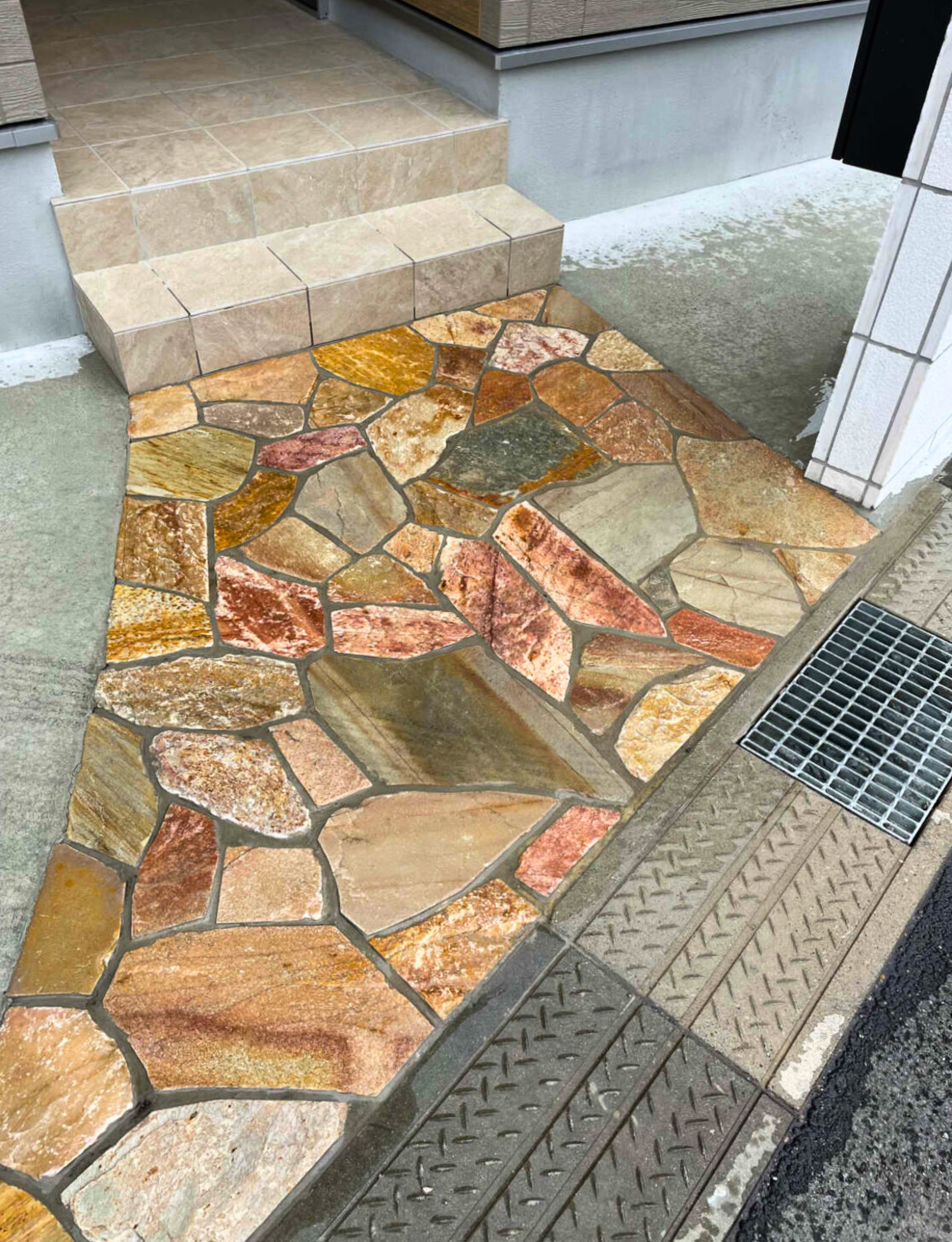 アプローチに乱形石を貼らせて頂きました。使用したのは、クレモナストーンのゴールデンイエローです。