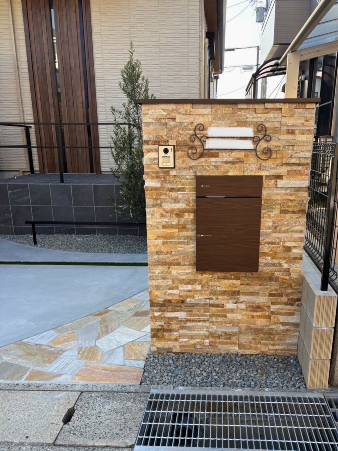 門柱タイルの鮮やかなイエローに、木目調の宅配ボックスと笠木のシックなブラウンが引き立ちますね♪