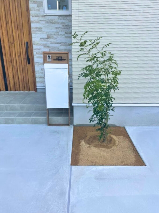 玄関前にスマート宅配ポストと、シンボルツリーを植えました。
