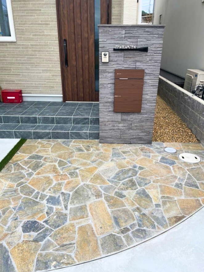 足元の乱形石は東洋工業のオークルストーンイスパニアオールド。